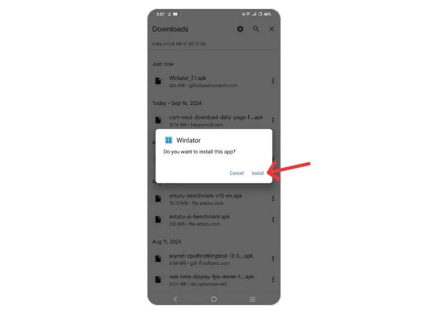 3. Install the APK: Open your file manager, go to Downloads, tap the Winlator APK, then tap Install.